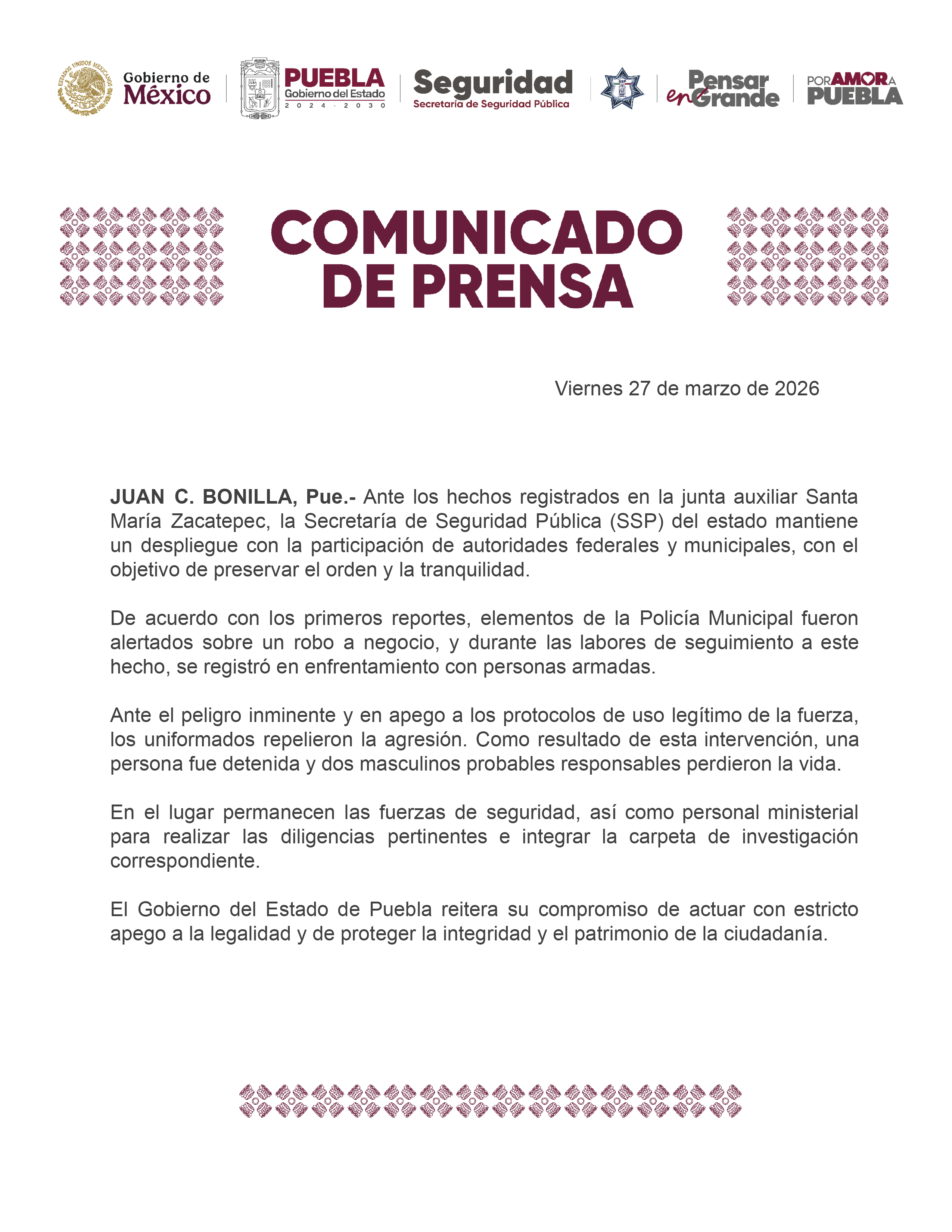 JUAN C. BONILLA, Pue.- Ante los hechos registrados en la junta auxiliar Santa María Zacatepec, la Secretaría de Seguridad Pública (SSP) del estado mantiene un despliegue con la participación de autoridades federales y municipales, con el objetivo de preservar el orden y la tranquilidad.