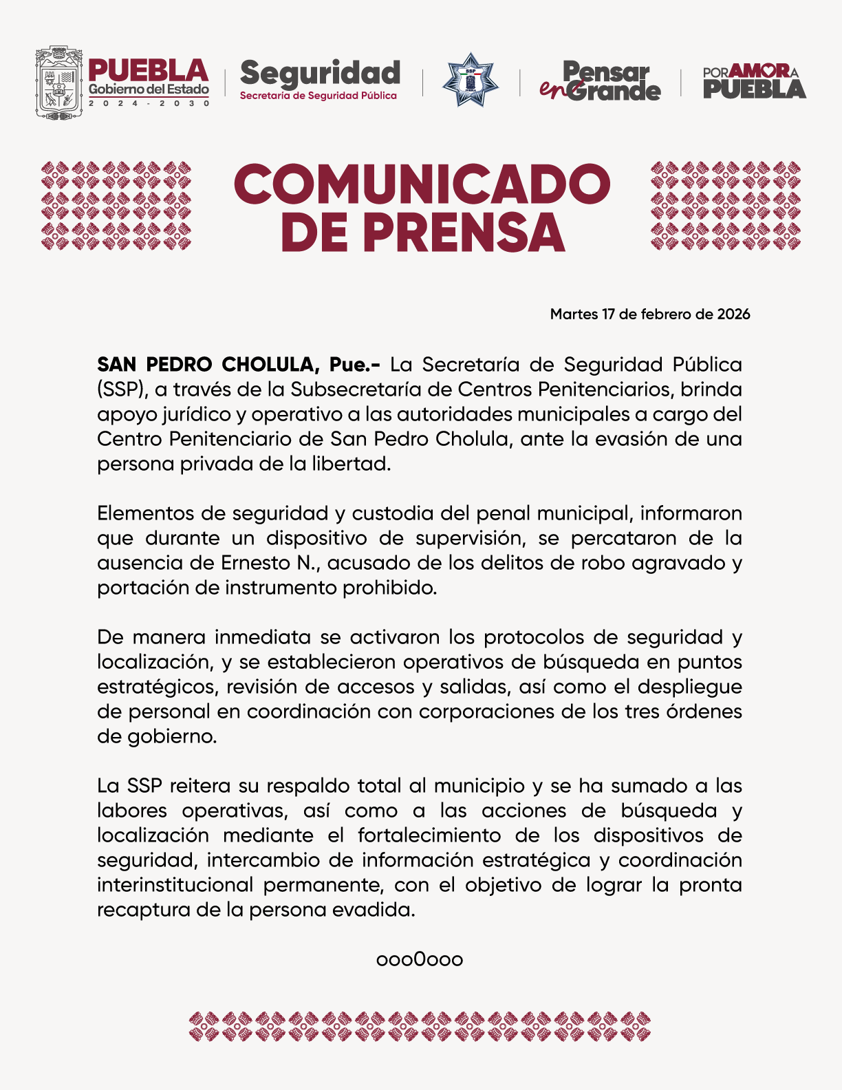 SAN PEDRO CHOLULA, Pue.- La Secretaria de Seguridad Pública (SSP), a través de la Subsecretaria de Centros Penitenciarios, brinda apoyo jurídico y operativo a las autoridades municipales a cargo del Centro Penitenciario de San Pedro Cholula, ante la evasión de una persona privada de la libertad.