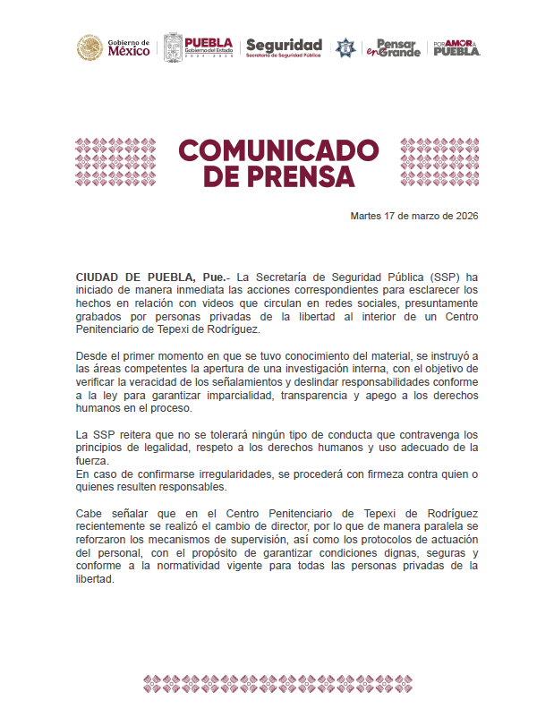 CIUDAD DE PUEBLA, Pue.- La Secretaría de Seguridad Pública (SSP) ha iniciado de manera inmediata las acciones correspondientes para esclarecer los hechos en relación con videos que circulan en redes sociales, presuntamente grabados por personas privadas de la libertad al interior de un Centro Penitenciario de Tepexi de Rodríguez.