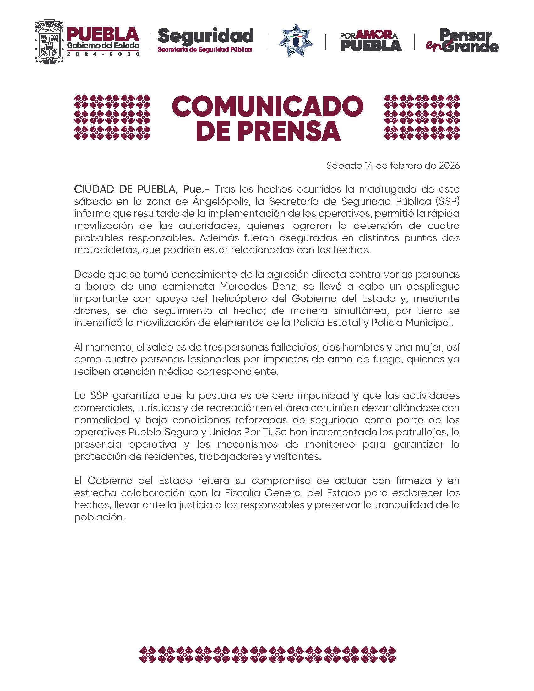 La SSP garantiza que la postura es de cero impunidad y que las actividades comerciales, turísticas y de recreación en el área continúan desarrollándose con normalidad y bajo condiciones reforzadas de seguridad como parte de los operativos Puebla Segura y Unidos Por Ti. Se han incrementado los patrullajes, la presencia operativa y los mecanismos de monitoreo para garantizar la protección de residentes, trabajadores y visitantes.