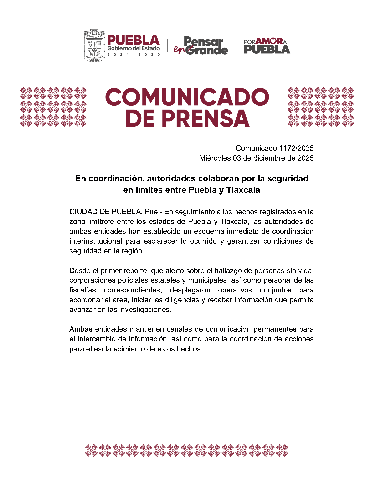 CIUDAD DE PUEBLA, Pue.- En seguimiento a los hechos registrados en la zona limítrofe entre los estados de Puebla y Tlaxcala, las autoridades de ambas entidades han establecido un esquema inmediato de coordinación interinstitucional para esclarecer lo ocurrido y garantizar condiciones de seguridad en la región.