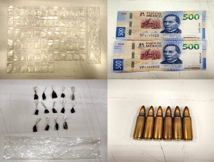 En el lugar de los hechos se aseguraron envoltorios con aparente metanfetamina, cocaína y cristal, así como cartuchos útiles calibre .223 y dinero en efectivo.