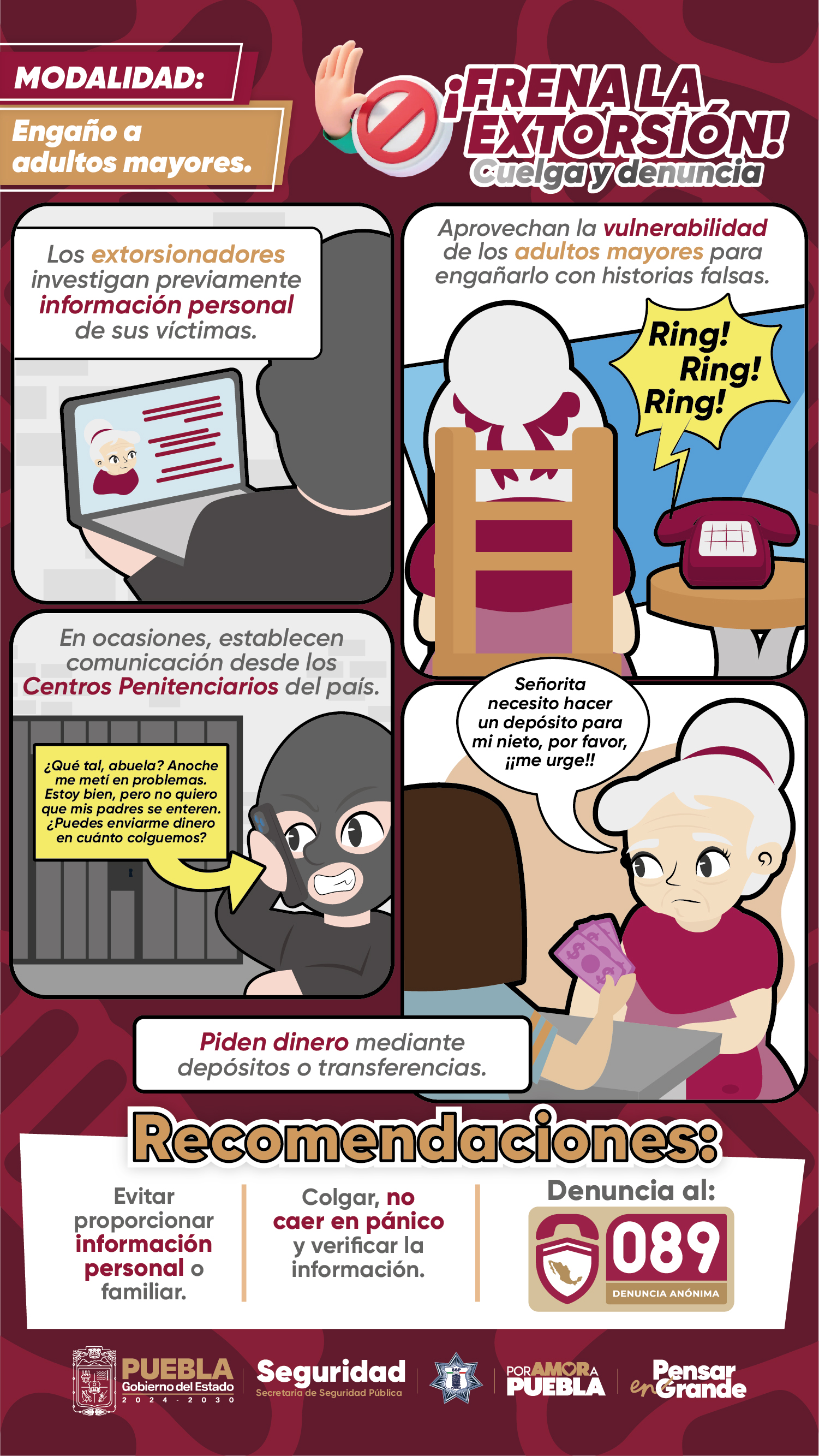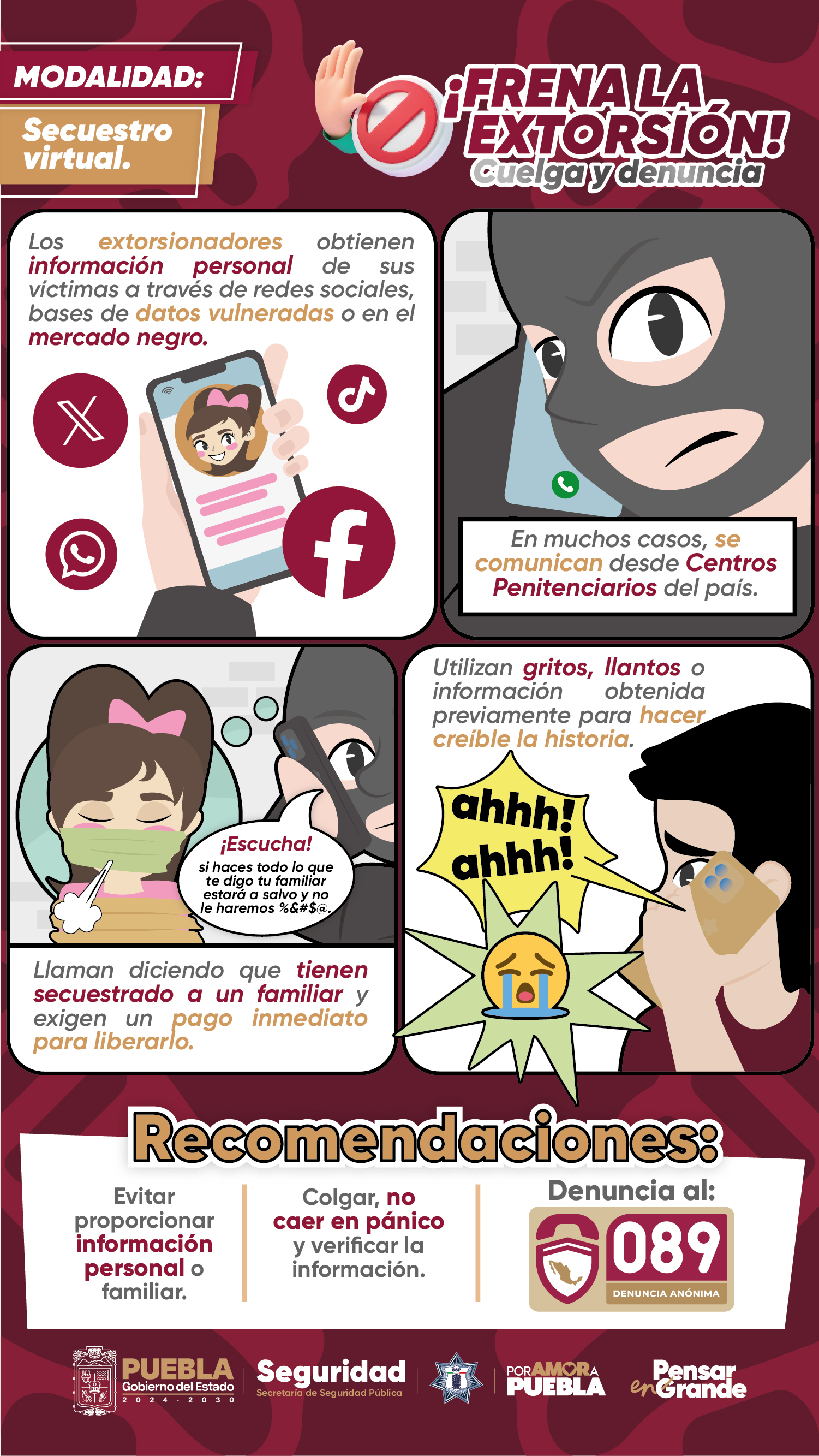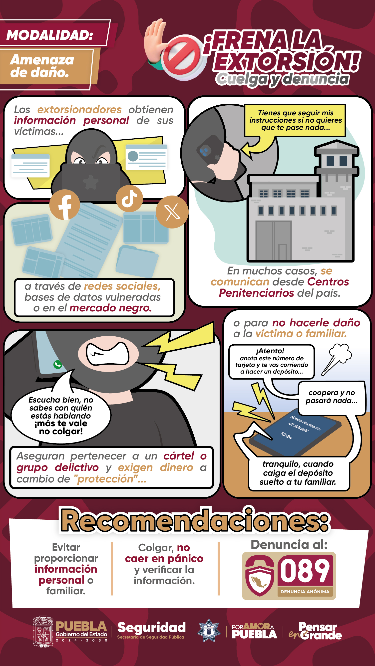 CIUDAD DE PUEBLA, Pue.- El Gobierno del Estado, a través de la Secretaría de Seguridad Pública (SSP), emprende una campaña en contra de la extorsión telefónica para evitar que las familias sean despojadas de su dinero, pasen por momentos de angustia y sepan cómo actuar cuando reciban una llamada telefónica en la que les amenazan.