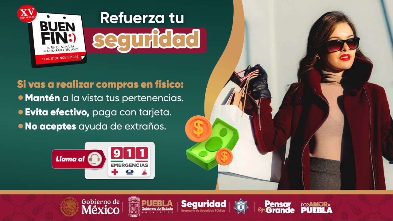 CIUDAD DE PUEBLA, Pue.- En el marco del “Buen Fin 2025”, la Secretaría de Seguridad Pública (SSP) exhorta a las y los poblanos a reforzar las medidas de autocuidado durante sus actividades comerciales y así, evitar situaciones de riesgo o peligro.