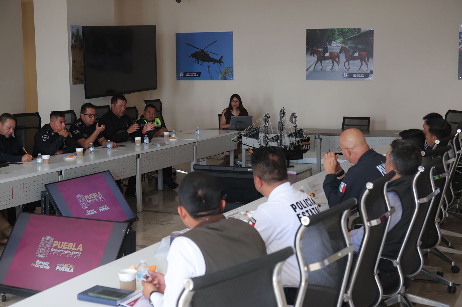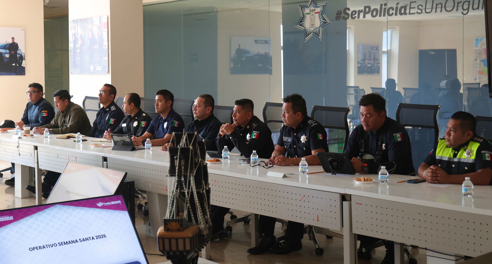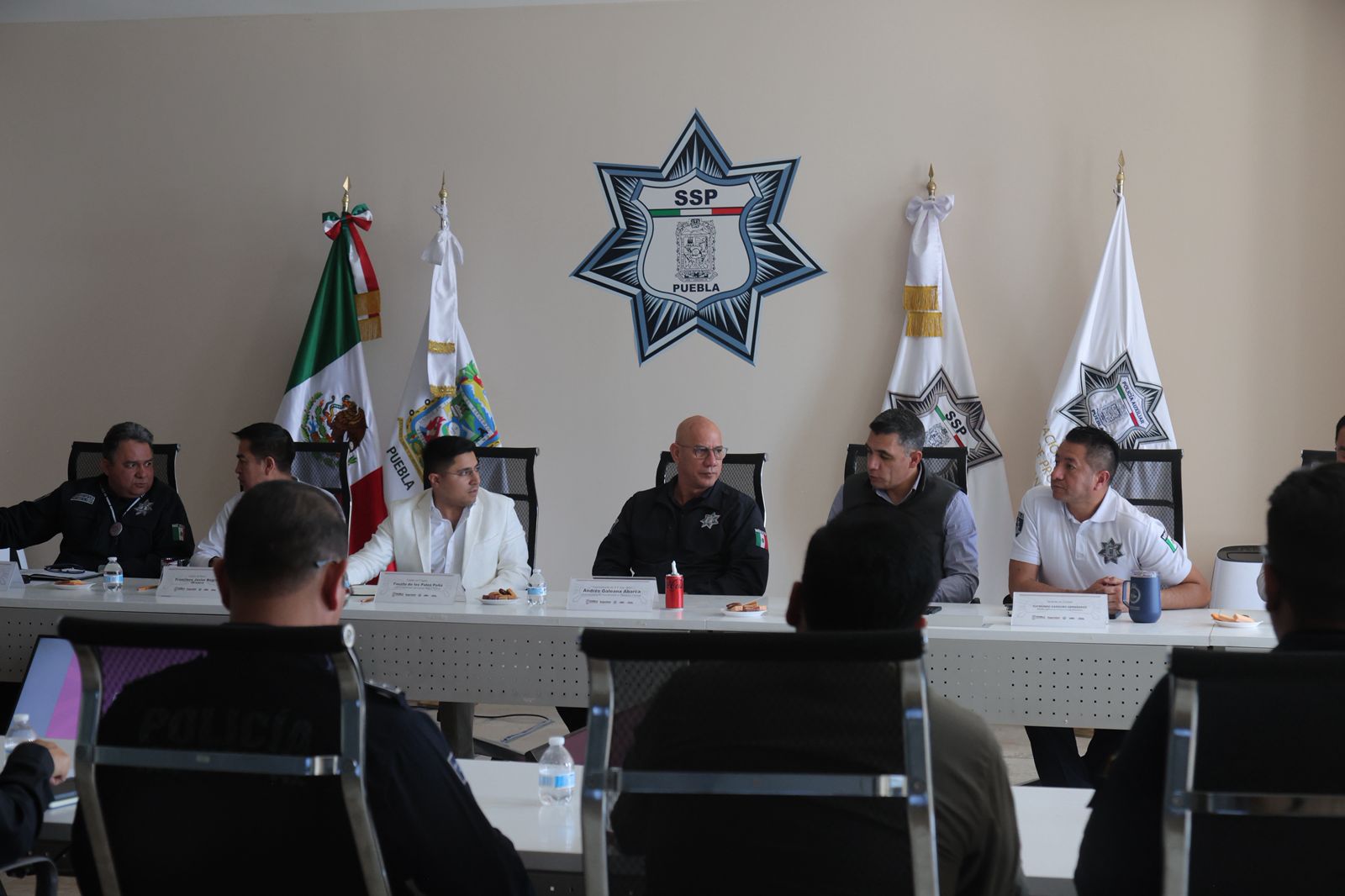 En representación del secretario de Seguridad Pública, vicealmirante Francisco Sánchez González, a esta mesa de trabajo se dio cita el subsecretario de Coordinación y Operación Policial, contralmirante Andrés Galeana Abarca; el Jefe de la Unidad del Estado Mayor Policial, capitán Fausto de los Palos Peña; el director general de la Policía Estatal Preventiva, teniente Raymundo Garduño Hernández; y el coordinador general del C5i, capitán Ervin Sibaja Cruz.